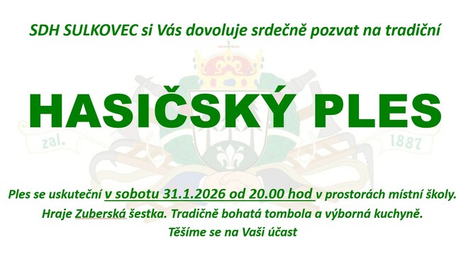 V sobotu 31.1.2026 ve 20.00 hod se v sále místní školy v Sulkovci, uskuteční tradiční Hasičský ples.K poslechu a tanci Vám bude hrát Zuberská šestka. Součástí plesu je tradičně výborná kuchyně a bohatá tombola. Těšíme se na Vaši účast.