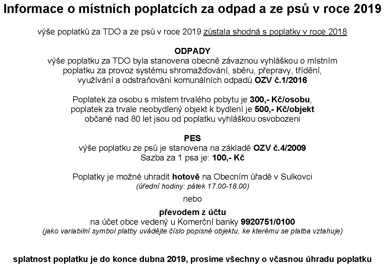 Informace k místním poplatkům za komunální odpad a poplatku ze psů v roce 2019