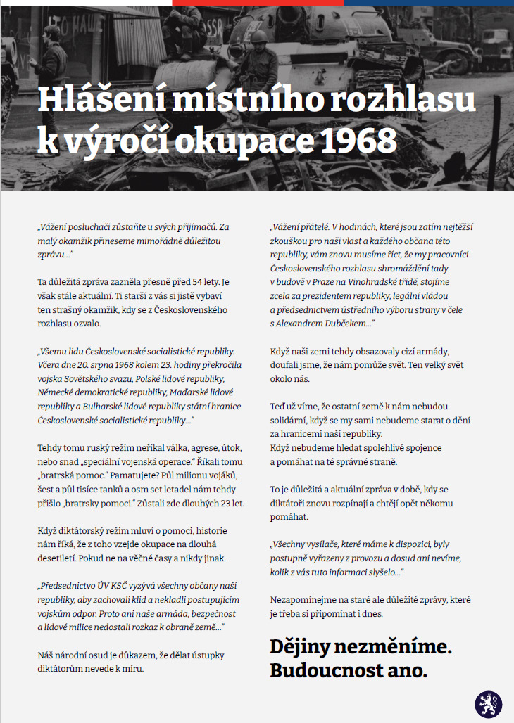 Hlášení obecního rozhlasu k výročí okupace 1968
