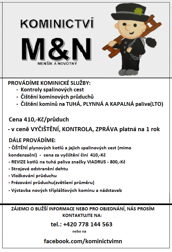 Firma českomoravské kominictví Menšík a Novotný bude v naší obci dne 25.10.2022 provádět kontroly a čištění komínů, spalinových cest, čištění spalinových cest u plynových kotlů a revize kotlů na tuhá paliva. Cena za čištění a kontrolu i se zprávou o provedení kontrol a čištění činí 410,-Kč.