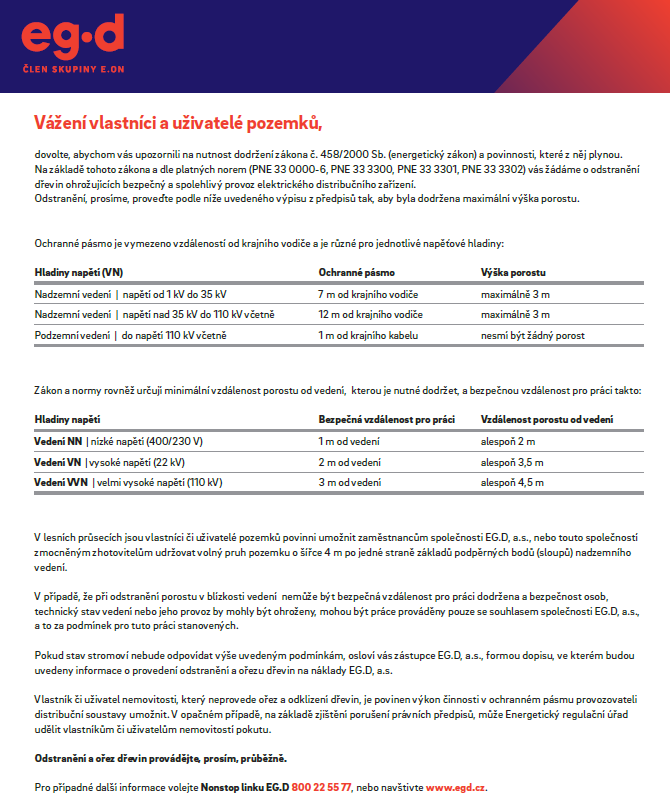 Upozornění vlastníkům a uživatelům pozemků - ořez dřevin v ochranném pásmu NN