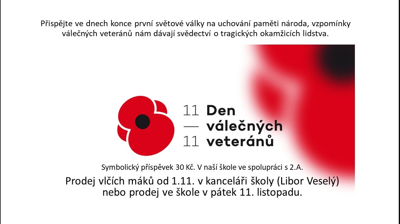 V pátek 11.listopadu bude probíhat skupinou studentů Gymnázia Bystřice n. P. na náměstí sbírka ke Dni veteránů, kterou pořádá organizace Post Bellum. Výtěžek z této sbírky bude určen na podporu účastníků odboje a lidí perzekuovaných komunistickým režimem.