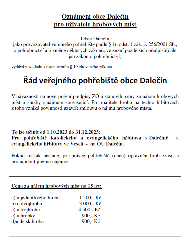 V letošním roce uplynulo desetileté nájemné hrobů na hřbitovech v Dalečíně a Veselí, a proto se uzavírají smlouvy nové.